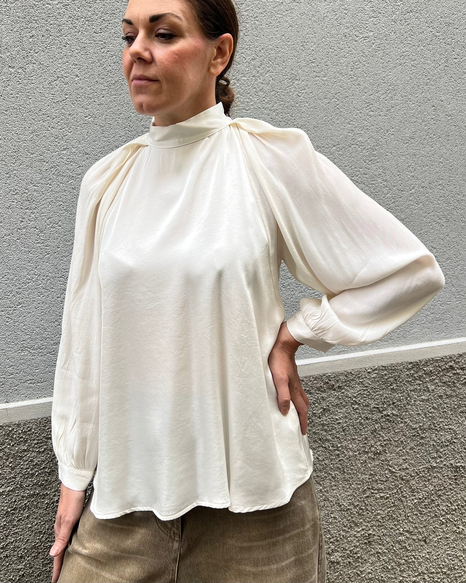 Raffinata blusa con colletto alto e polsini in viscosa lucida che creano un delicato contrasto con le maniche a palloncino in viscosa opaca. La linea fluida la rende perfetta da indossare sia con pantaloni che con gonne.