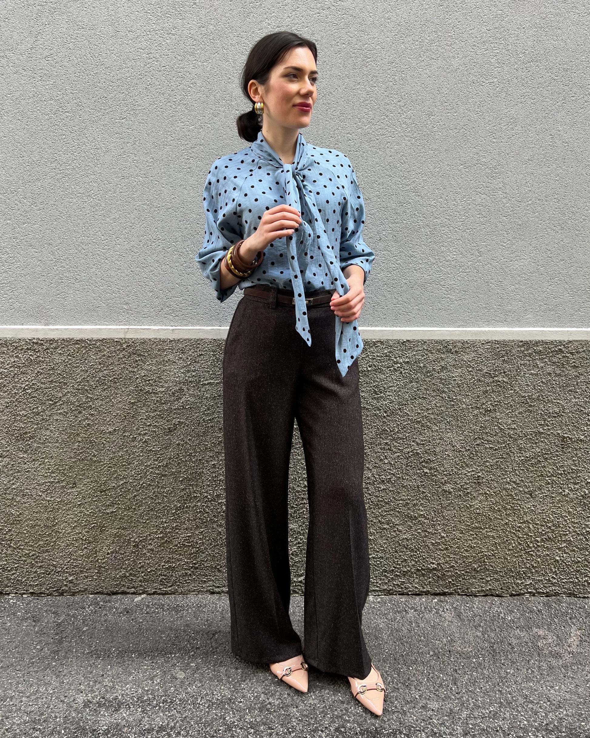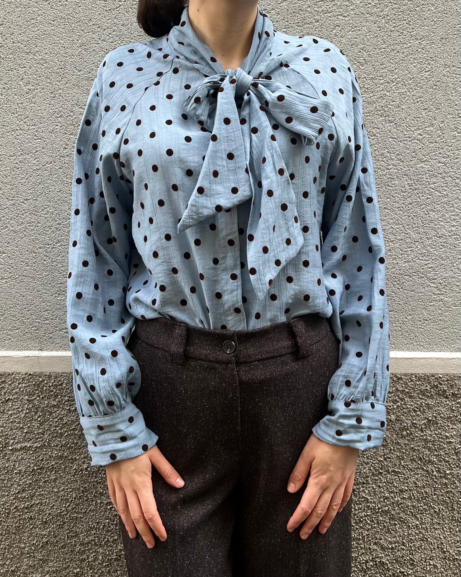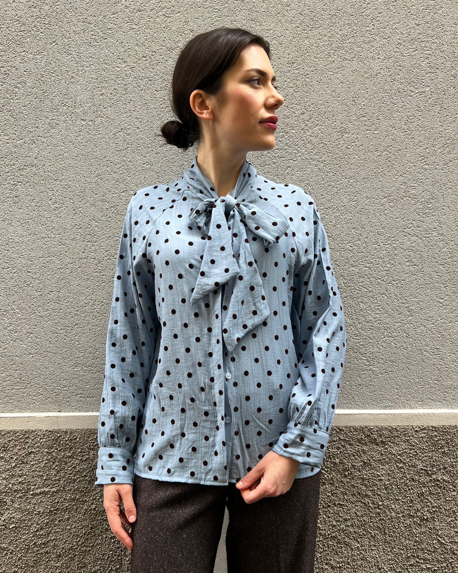 Camicia con collo alto regolabile con fiocco nello stesso tessuto stampa a pois. Maniche lunghe con polsino. Fondo dritto. Chiusura frontale con bottoni.