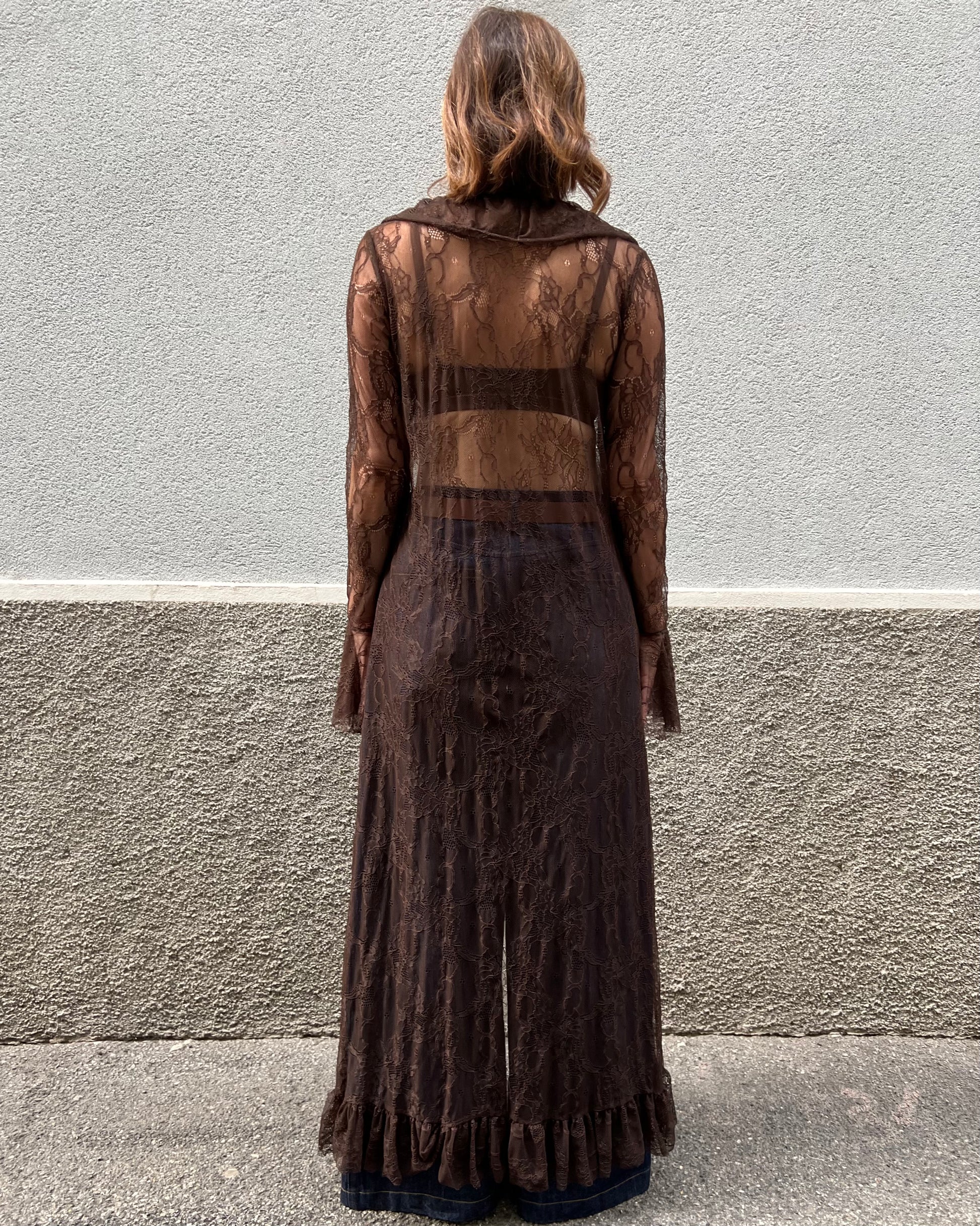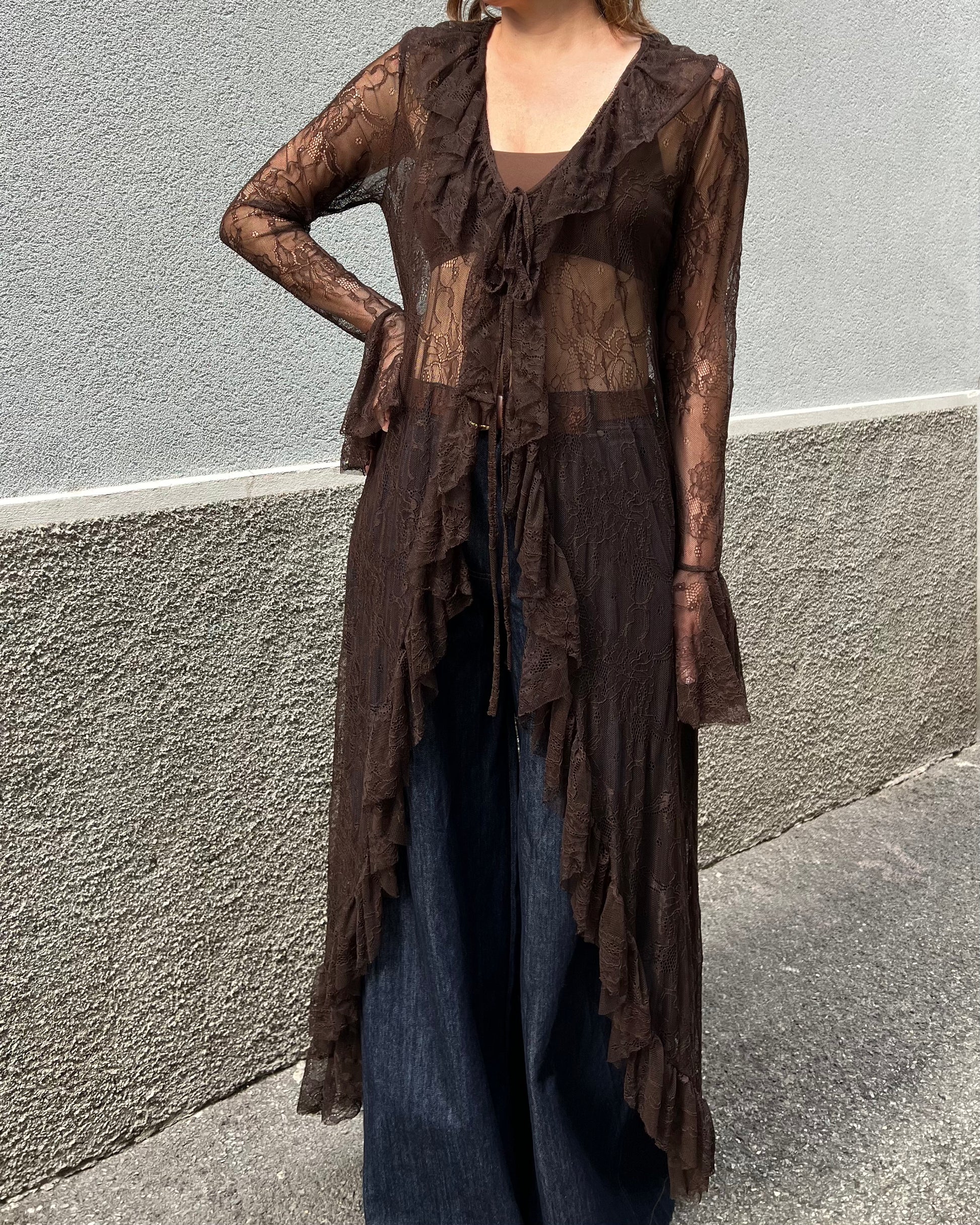 Kimono lungo in pizzo semi-trasparente impreziosito da una rouches delicata che percorre il bordo frontale. Manica ampia con balza per un tocco bohemien elegante, perfetto per sovrapposizioni su abiti, body o lingerie.